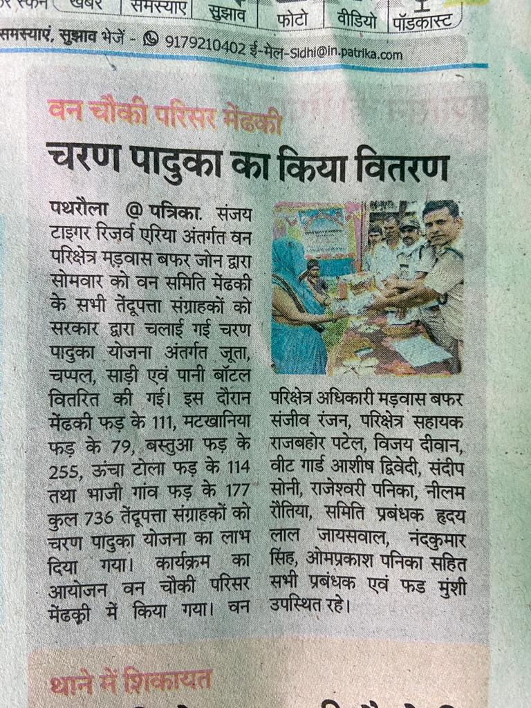 मुख्यमंत्री चरण पादुका योजना के तहत टाइगर रिज़र्व के बफर क्षेत्रों में माननीय धौहनी विधायक श्री कुंवर सिंह टेकाम के मुख्य आतिथ्य में ,जन प्रतिनिधियों एवं वन विभाग के अधिकारियों - कर्मचारियों की उपस्थिति में तेंदूपत्ता संग्राहकों को जूते, चप्पल, साड़ी , छाता एवं पानी बॉटल वितरित किये गए.